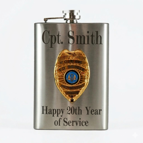 This premium 8oz hip flask features a high quality color "to protect and serve" police emblem, welded (not soldered) joints and food grade stainless steel. This is one of our highest quality hip flasks and each flask is individually leak tested and comes gift packed in a plain black box! If your looking for a decorative hip flask or are just inspired this is the flask for you. The 8oz capacity combined with the compact dimensions of 5-3/4" x 3-5/8" make this the perfect size flask for any pocket on your outfit.